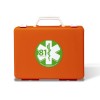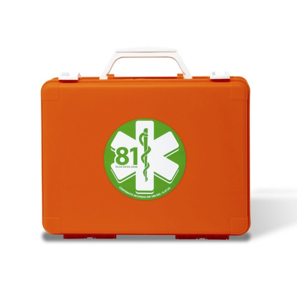 Valigetta realizzata in polipropilene antiurto, colore arancio, supporto per attacco a parete, maniglia per trasporto, chiusura con 2 clip rotanti. Contenuto a norma del DM 388 del 15/07/2003 allegato 2 e D.L. 81 del 09/04/08 art.45. per aziende o unità produttive con meno di tre lavoratori che non rientrano nel gruppo A . L’art.2 punto 5 del DM 388 del 15.7.2003 prevede che il contenuto di cui all’allegato 2 deve essere fornito ai lavoratori che operano in luoghi diversi dalla sede aziendale o unità produttiva. CONTENUTO: 1 Copia Decreto Min 388 del 15.07.03; 2 Paia guanti sterili; 1 Flacone disinfettante 125 ml IODOPOVIDONE al 10% iodio; 1 soluzione fisiologica sterile 250 ml CE; 1 Busta garza compressa sterile 18×40 cm; 3 Buste garza compressa sterile 10×10 cm; 1 Pinza sterile; 1 Confezione di cotone idrofilo; 1 PLASTOSAN 10 cerotti assortiti; 1 Rocchetto cerotto adesivo m 5×2,5 cm; 1 Benda di garza da m 4×10 cm; 1 Paio di forbici 10 cm; 1 Laccio emostatico; 1 ICE PACK ghiaccio istantaneo monouso; 1 Sacchetto per rifiuti sanitari 250×350 mm;