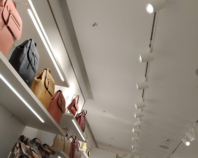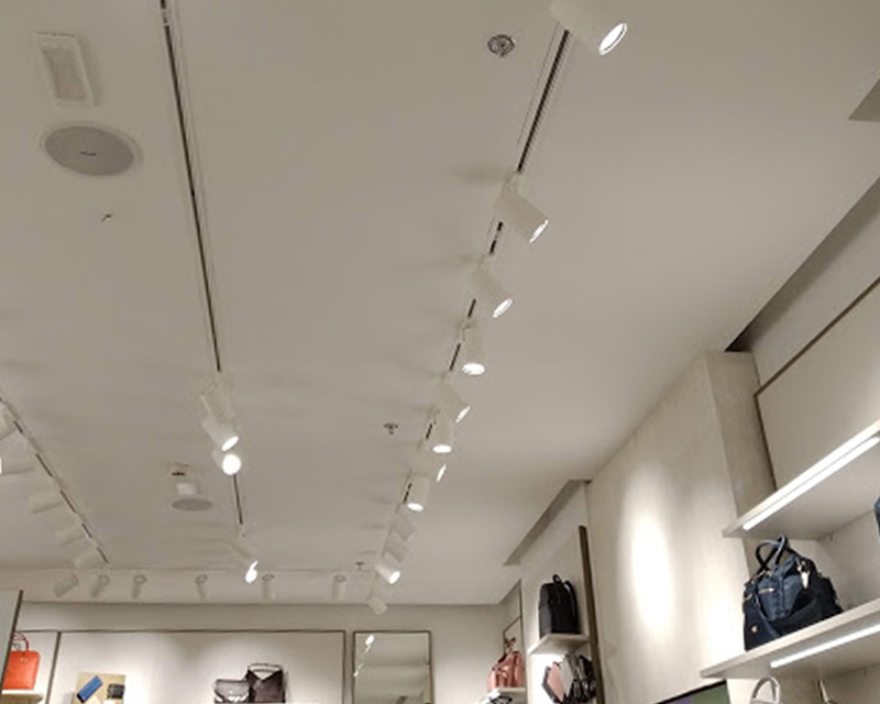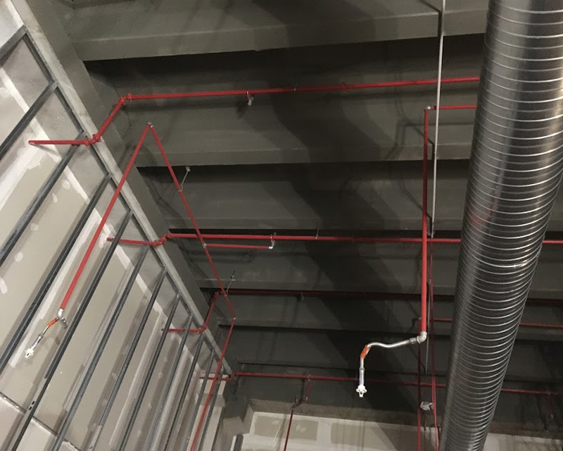 Costruzione seconda linea sprinkler con l’utilizzo di flessibili ancorati al controsoffitto in cartongesso. Per motivi di sicurezza e considerato che l’impianto presistente era sprovvisto di valvola sezionatrice, si è operato in orari notturni drenando per intero le tubazioni diramate dalla valvola di allarme sprinkler a valle. L’operazione ha richiesto particolare cura nella fase di ripristino pressione in quanto l’intero impianto di distribuzione durante questo tipo di intervento viene fortemente sollecitato.